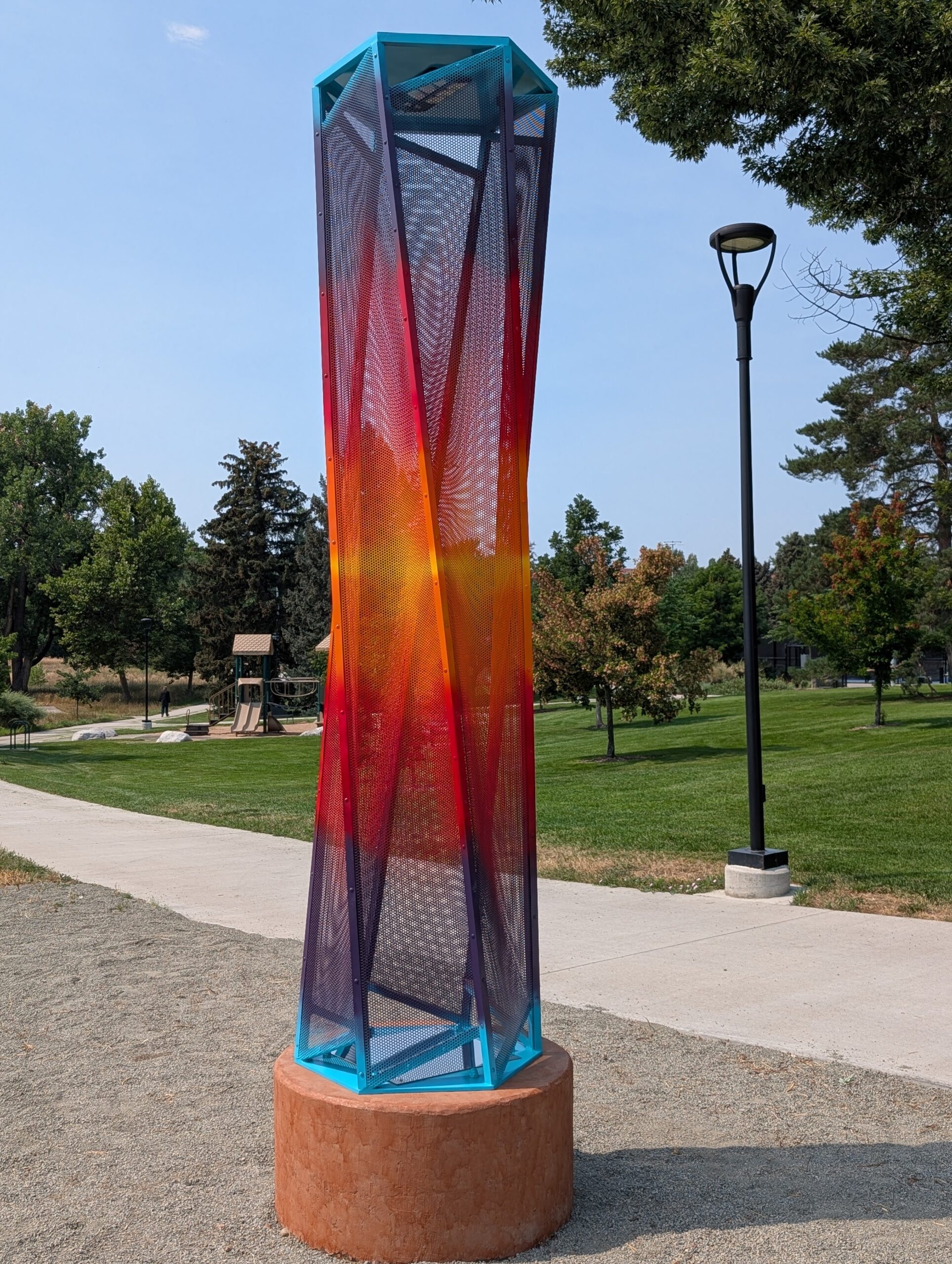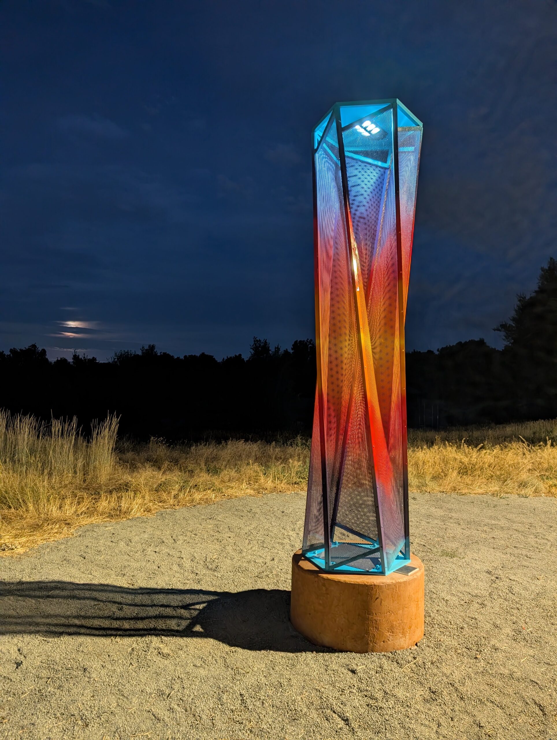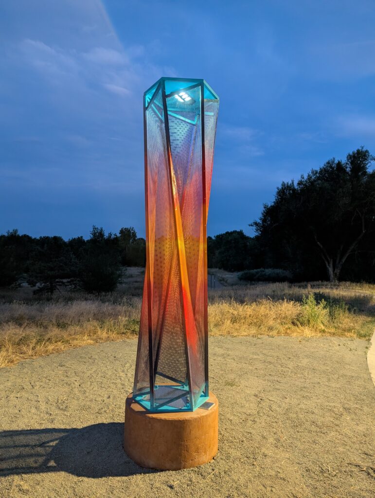 Colorful mesh screens overlap to create an optical illusion – a Moiré Effect that causes the surfaces to appear to ripple and dance as the viewers move around the piece. Solar lighting at night causes the piece to glow from within.