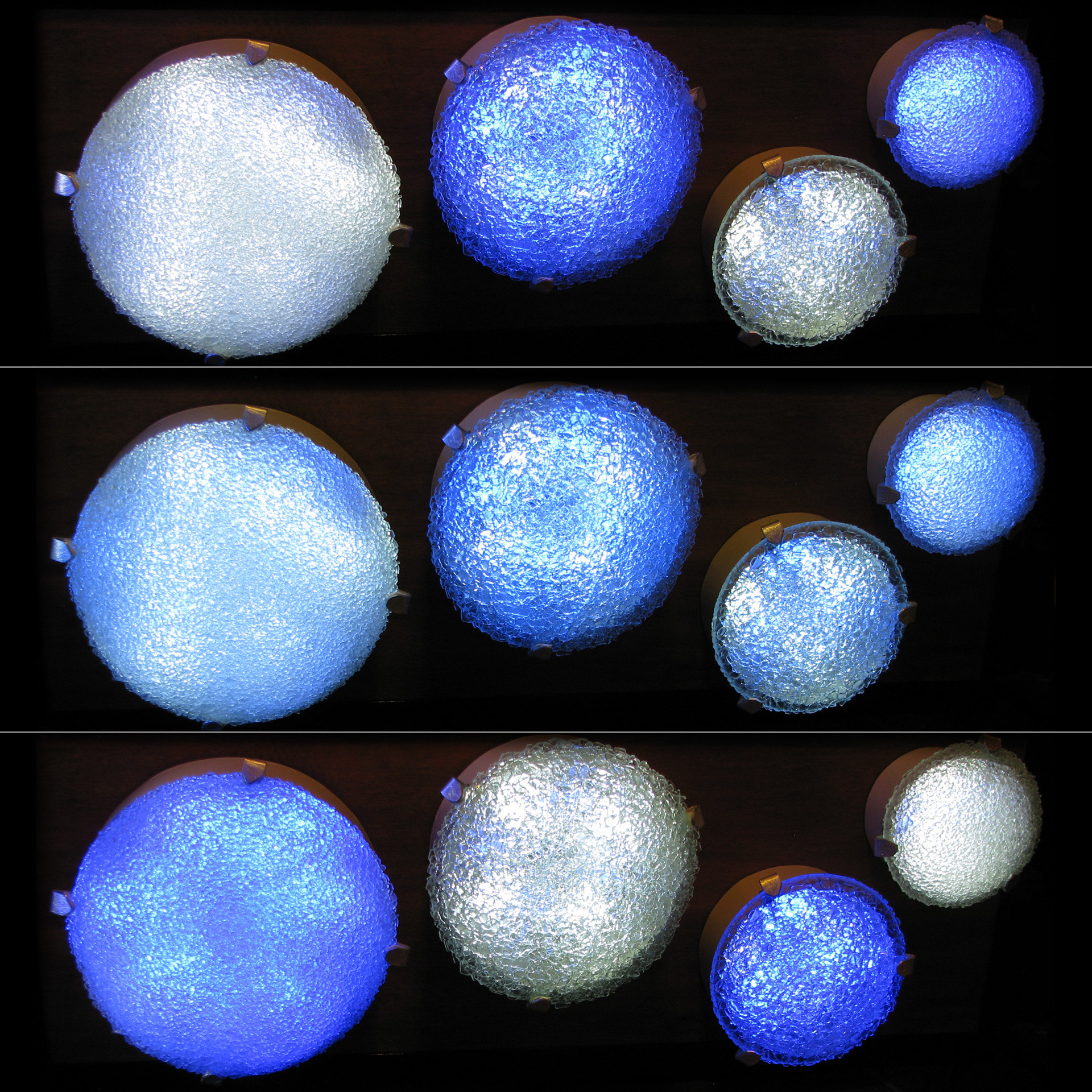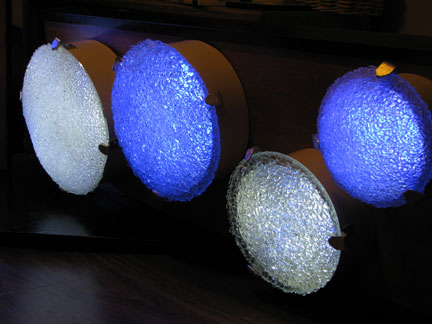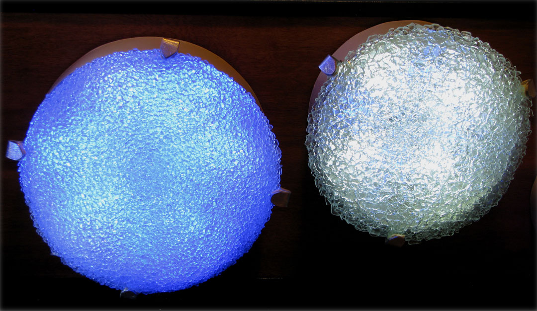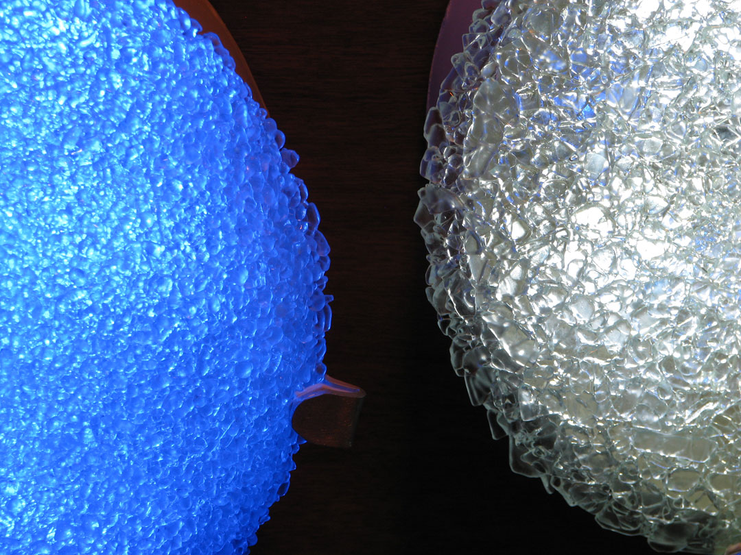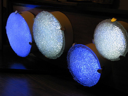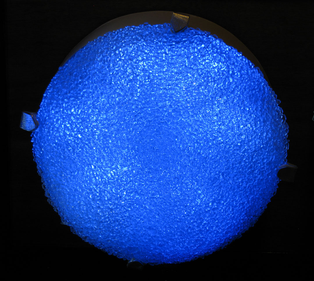 400 recycled glass fixtures diffuse the light of 6000 blue and white LEDs along the 5 story tall stairwell. On its own the lights in the sculpture fade back and forth between white and blue light, at a pace that mimics a nice slow relaxing breath – in and out. When someone uses the stairwell, they trigger a motion detector that causes the piece to “breathe” faster. As if the stairwell is exercising along with the climber. After the person has left, the sculpture will start to catch its breath, back to its slow meditative pace.