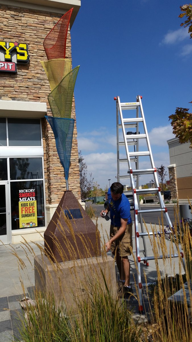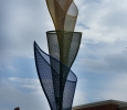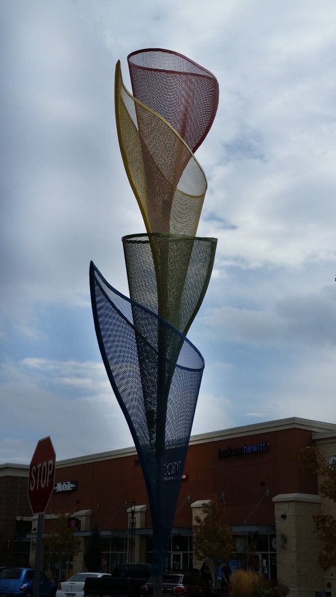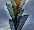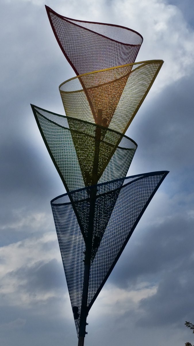 This sculpture uses layers of meshed steel that overlap and combine to create a Moiré illusion full of complex patterns. Waves and undulations appear to ripple throughout the piece as the viewer moves around it. Colors blend and change through the multiple layers of partially transparent material.