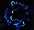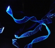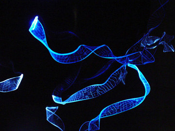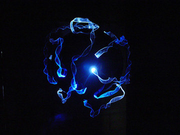 This piece describes the warping paths of light as they travel through the fabric of Spacetime near massive bodies.  The curves of Spacetime are caused by the presence of matter, and the distortions are more pronounced around massive bodies.  Such distortions cause it to appear as if light is being warped as it approaches massive bodies, however the light is actually traveling in a straight line through a warped Spacetime.